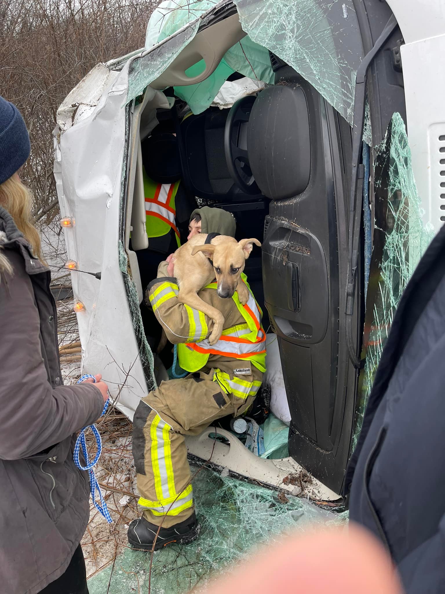 Homeless dogs on a trek from Austin, Texas, to a Washington County, Wisconsin, animal shelter survived a frightening rollover crash on New Year’s Eve. According to Big Bend Fire Department, their crew responded to the I-43 accident at 7:55 a.m. and found a single-vehicle cargo van that had rolled over with caged dogs inside.
