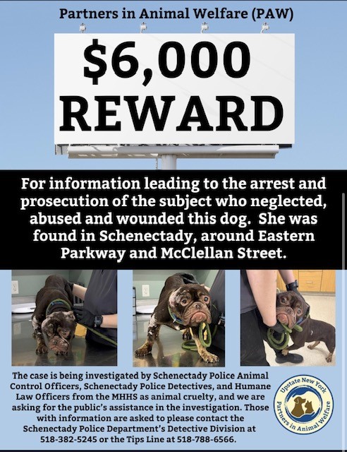 In an effort to help solve this case, Partners in Animal Welfare (PAW) have joined with Animal Nation and a private donor to offer a $6,000 reward for the arrest and prosecution of the person or persons responsible for her injuries. Additionally, the New York State Humane Association is offering a $1,000 reward for their arrest and conviction.