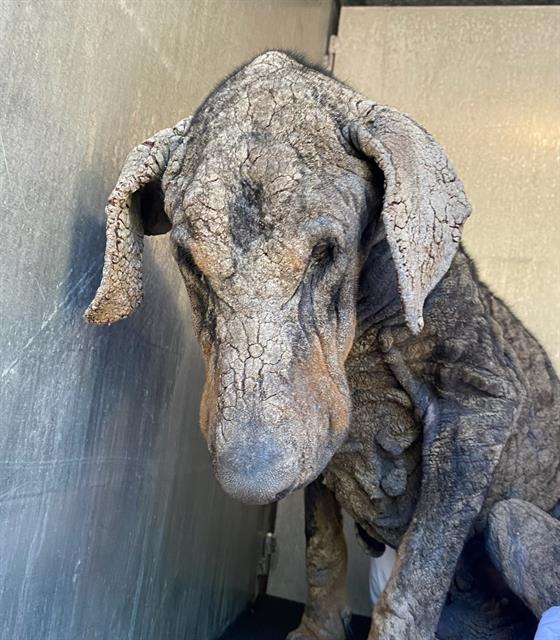 San Antonio, TX – A dog picked up as a stray and taken to the San Antonio Animal Care Services facility on October 14 has been so badly neglected that his breed is unrecognizable. The shelter has listed this dog as a “black and gray” hound, but a close inspection of his intake photo shows coloring that may indicate he is a Doberman.