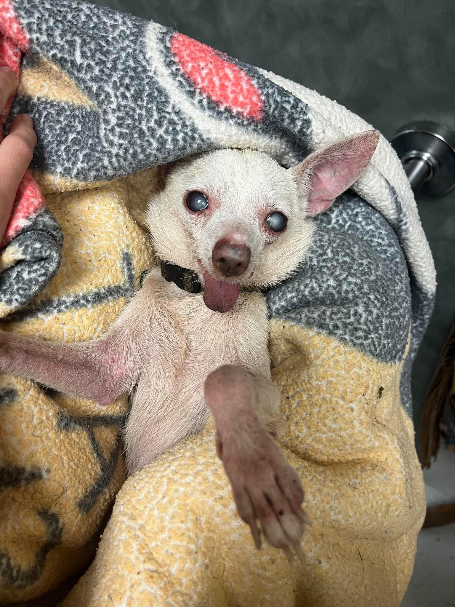 According to shelter notes, the dog, Pepito, was injured when he was picked up, and he is also blind, toothless, and missing some hair. His adoption notes state: