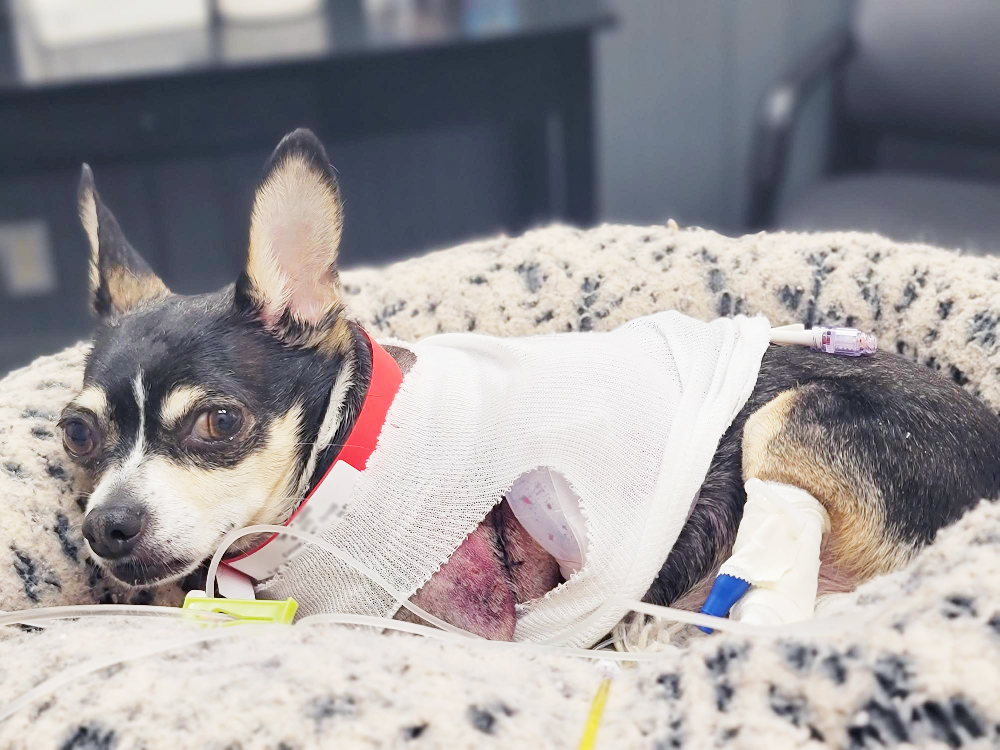 Jose was in shock and badly bruised when he arrived at the veterinary hospital, but round-the-clock care in the ICU, a blood transfusion, and surgery helped save his life. The veterinary hospital said: