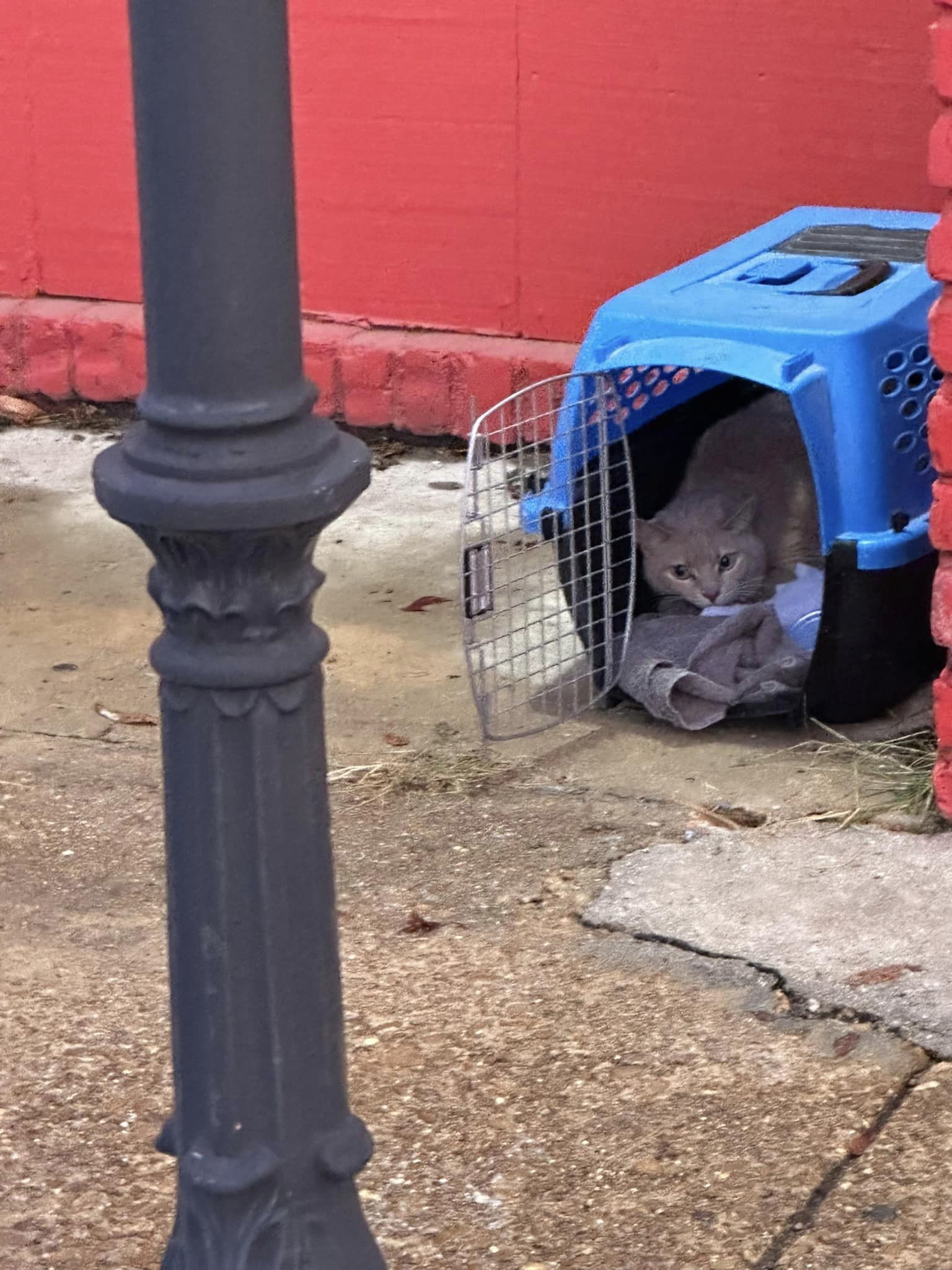 A couple saw the crated cat in the parking lot and moved it closer to the restaurant to keep it from getting hit, telling restaurant staff that they could not take the cat home. The abandoned cat was taken inside for a warm meal and free fish-tank “entertainment.”