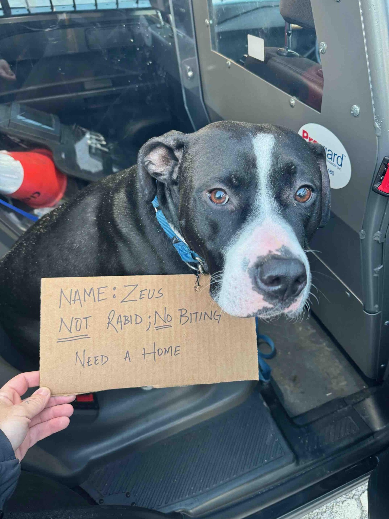 The person who left him wrote a note on a piece of cardboard that reads, “Name: Zeus, Not Rabid, No Biting, Need a home.”
