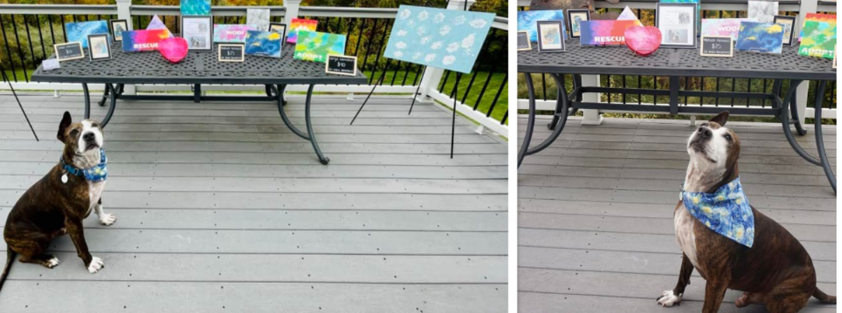 Brookfield, CT – A dog who survived life in a North Carolina dogfighting ring is searching for his forever family. His name is Van Gogh (named for the famous, albeit emotionally tortured artist who severed his own ear) and like his namesake, he is an artist. Instead of using a brush, this four-legged painter uses his tongue to create one-of-a-kind pieces of art (the canvas with paint is covered by a plastic bag that has some enticing peanut butter on the outside).