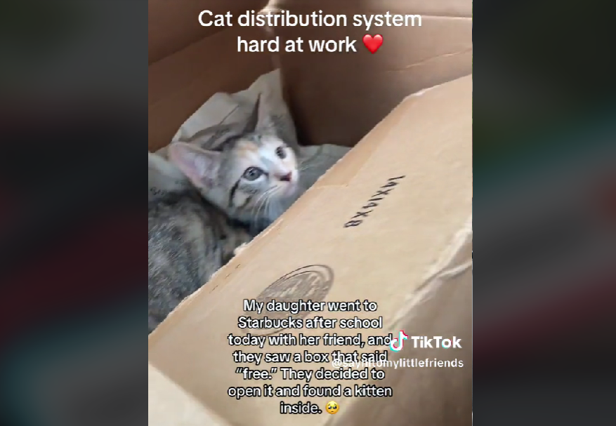 An adorable kitten has a new home after a teenage girl spotted a box outside of Starbucks with the word “Free” written on the outside. According to a touching TikTok video, the teen decided to look in the box and she found a sweet kitten with a note that read, “pls take, cannot take care of it.”