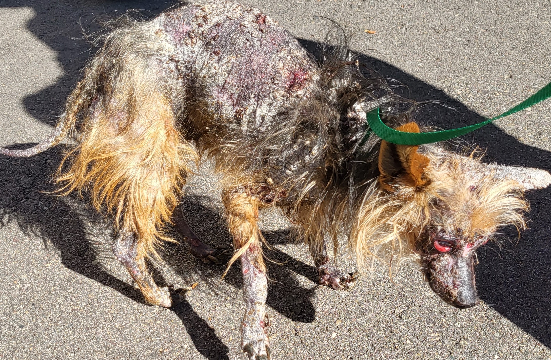 According to a news release from the agency, the seven-year-old dog was “near death” when he was discovered on March 28. The release states that the dog was missing hair, had thick, crusty skin, and he was malnourished.