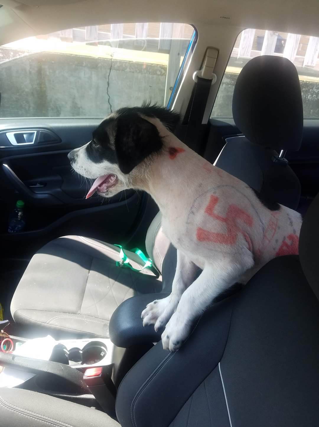 This 3 month old pup was shaved and has swastikas drawn all over her body.