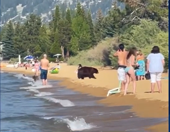 On Sunday, people enjoying the sand and beach at Pope Beach, in South Lake Tahoe, had some surprising company. A mother bear and her three cubs visited the area for some frolicking in the water, and even stole one beachgoer’s cooler!