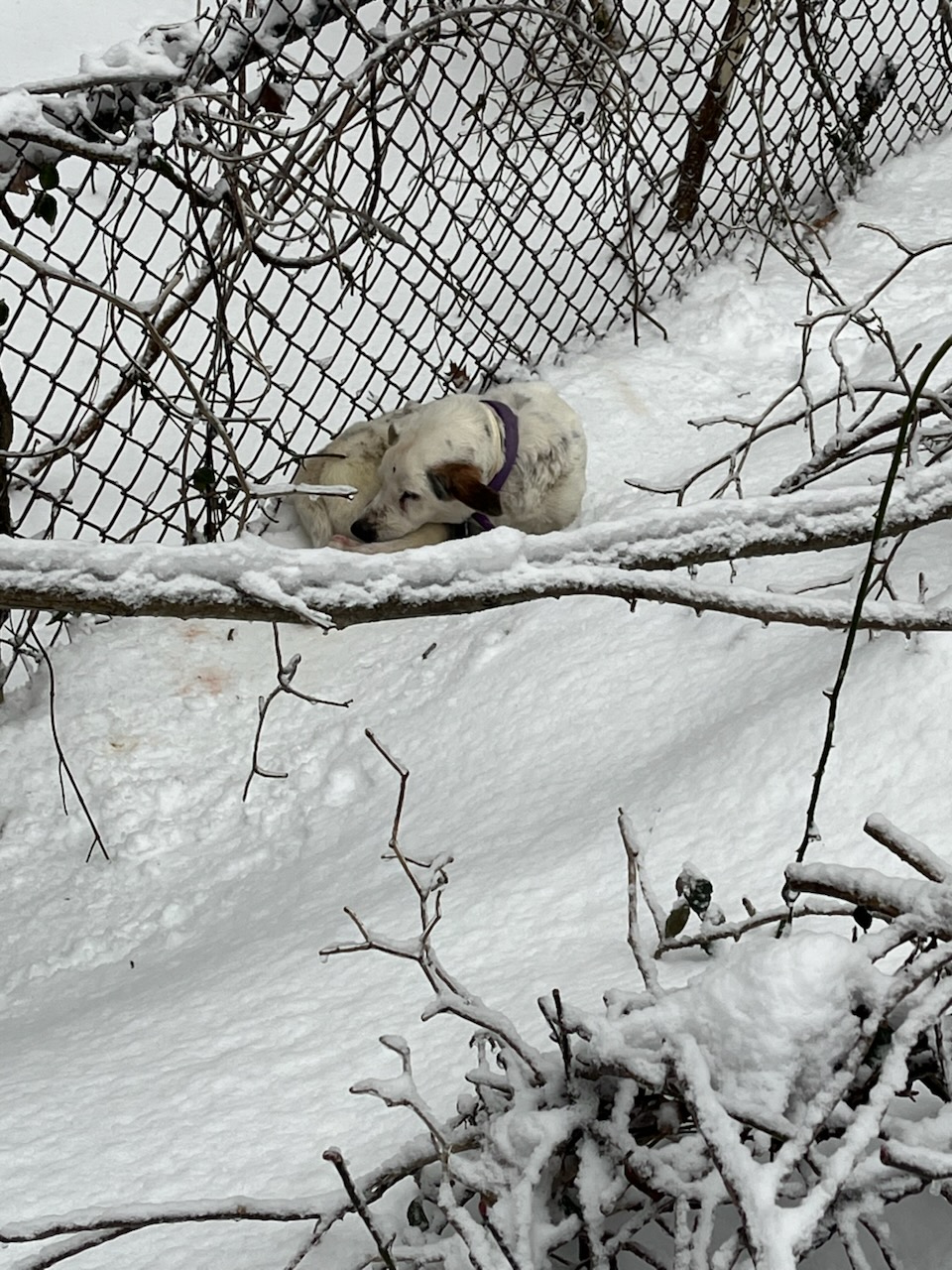 Ofc. Ashley carefully made her way down the icy slope and over the fence, following faint whining into the wooded area. There she found Connor, trapped and unable to walk. Ofc Ashley carried his trembling body back up the hill with help from the neighbors and transported him home.