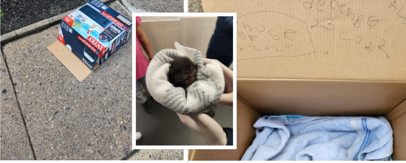 At just one day old, little Warrior was found in a box dumped outside of the shelter this morning. With nothing but a blanket for warmth, staff members found him crying, hungry, and with his umbilical cord still attached.