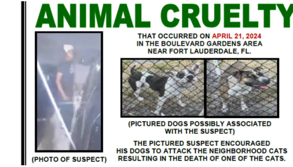 Broward County, FL – In mid-April, surveillance video captured footage showing a male encouraging his dog to attack and kill an innocent cat named Ringo. The cat was sitting safely on top of a vehicle before the male with the dogs scared it off.