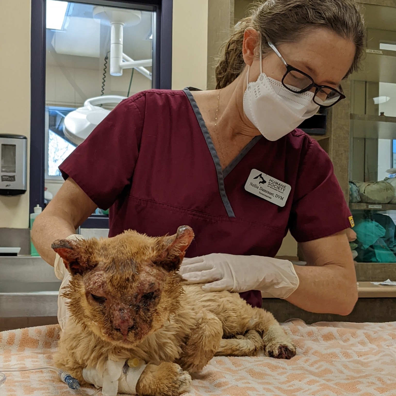 This sweet orange tabby arrived at HSBV, suffering from severe burns after the Marshall Fire. After a few visits with our partners at local emergency veterinary clinics, he was transferred to us for specialized treatments and extended care.