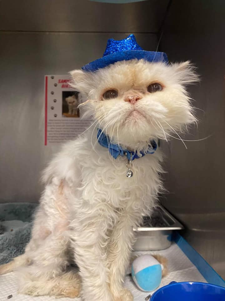 Sammy’s friends not only wanted to celebrate the elderly cat’s special day, they also hoped to find him a home to spend the rest of his life in. They wrote: