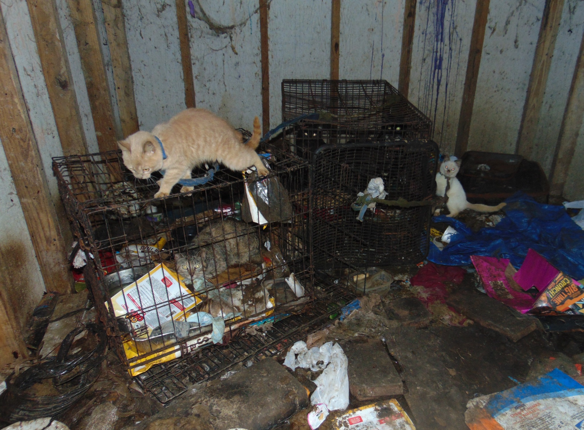Six cats and one dog were found inside the small shed. Another six dogs were chained to various items on the property while eight more were inside the garage. Four additional dogs and one cat were in the home in deplorable living conditions.