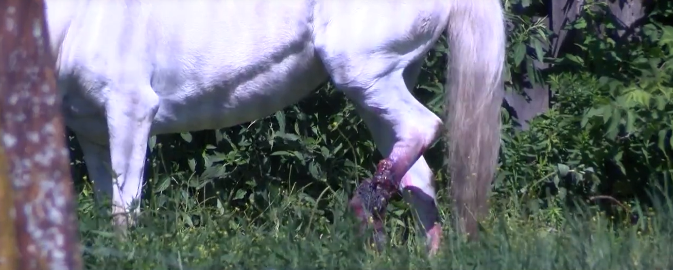 The authorities have stated that a veterinarian came out to the property to examine the horse, and determined that the injury is “consistent with a cut from barbed wire fencing” and it is being treated with a red salve.