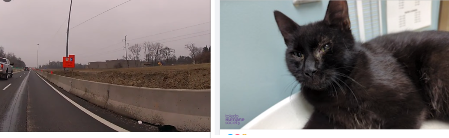 Lucas County, OH – A terrified cat, who found himself alongside a busy Ohio interstate, was recently rescued by a kind Ohio State Highway trooper. A video of the rescue effort was posted to the agency’s Facebook page on Tuesday. The footage shows Tpr. Katie Thomas stopping to save the frightened feline who was located on the side of I-475 in Lucas County.