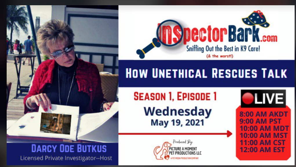 On this show, your Host, Darcy Butkus, President of Inspector Bark Detective Agency located in the State of Georgia will have a special guest speaker, Karin Less from Alaska to discuss “How Unethical Rescues Talk.” Karin is a language & communication analyst & a long-standing animal welfare advocate. She holds four college graduate degrees.