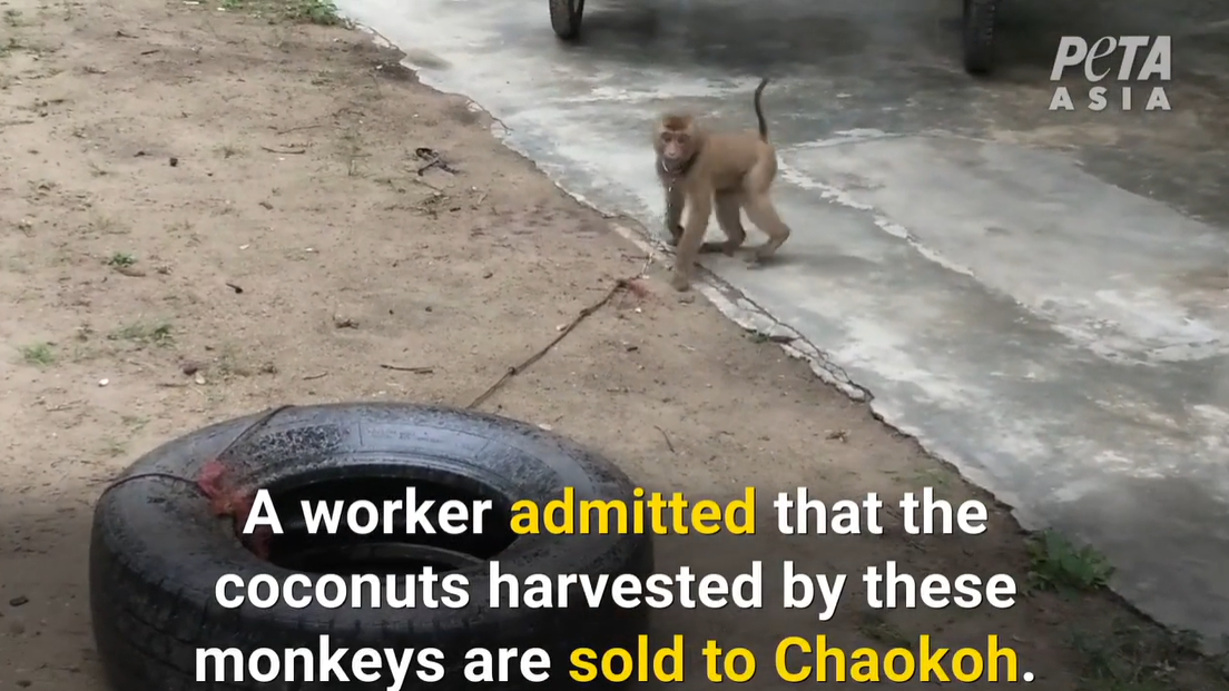 The video footage shows monkeys chained, caged, collared and forbidden from socializing, in order to work for the company in Thailand.