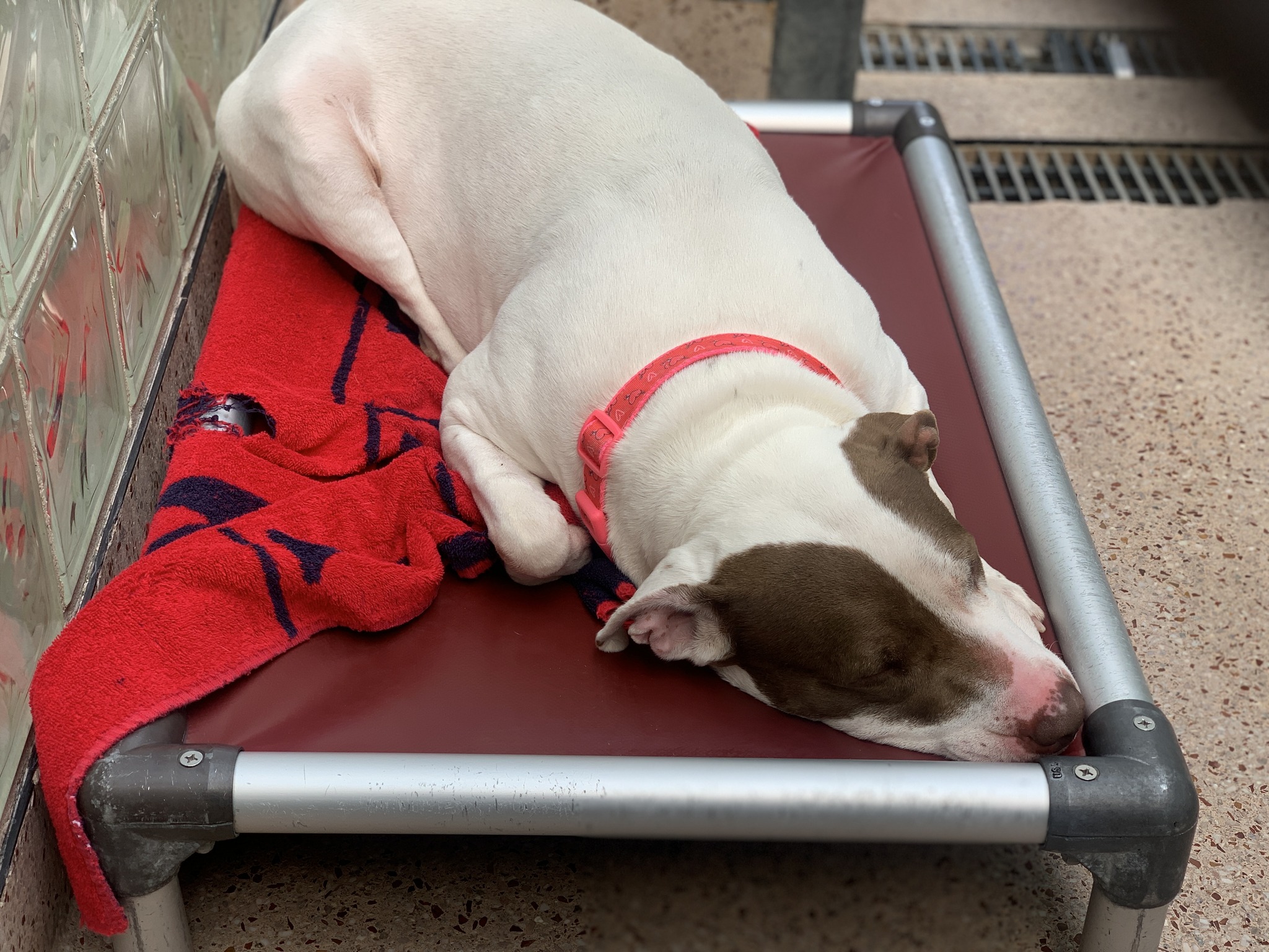 On Monday, the animal welfare agency posted a photo of the slumbering dog, explaining Rosie’s reaction as the kennel doors opened to the public: